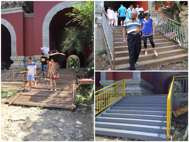 “洞子口”是武當老百姓對玉虛宮鐵路涵洞的俗稱,這也是玉虛宮與武當山步行街連接的唯一人行通道。2013年至今,經過3年多漫長施工,玉虛宮鐵路涵洞仿古建工程基本竣工,但唯獨步行街一側行人臺階遲遲未建,一直使用臨時竹排代替石梯供行人通行,給居住在玉虛宮涵洞以南居民以及游客出行帶來極大不便,特別給老人、孩童出行造成更大困難,時常有路人在此摔倒受傷。